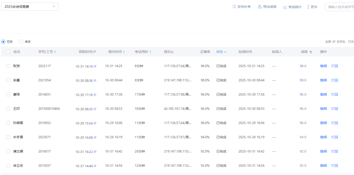 为弘扬中国传统文化,进一步激发教职工对校园文化的认同感,展现教职工精神风貌,学校工会于2025年10月29日至31日组织开展古诗词知识竞赛活动,共30位教职工参赛。