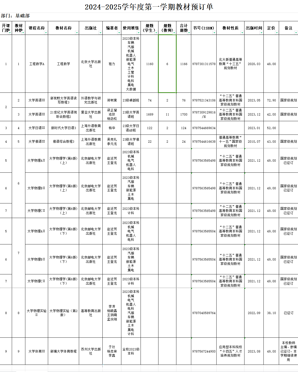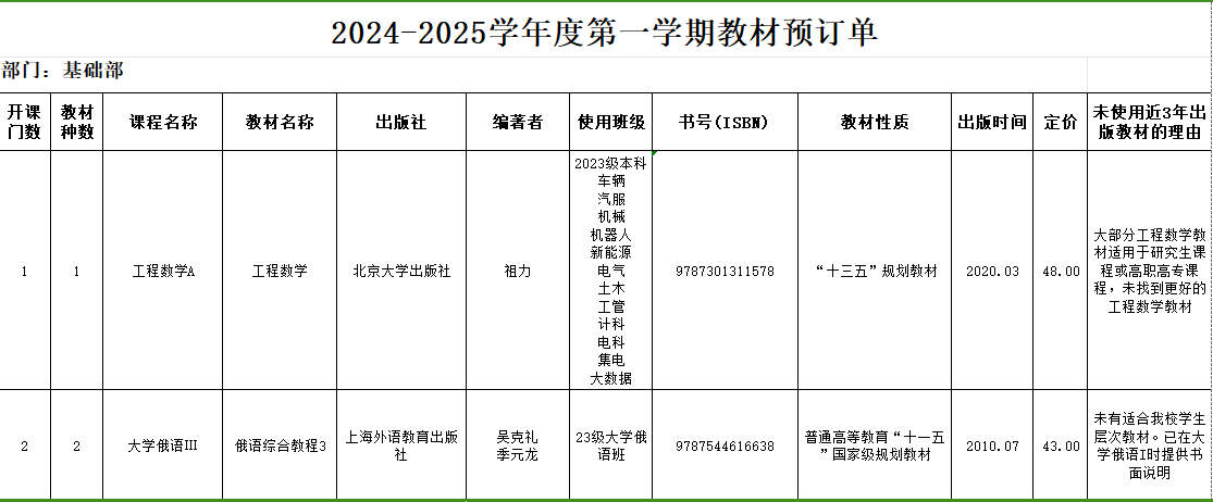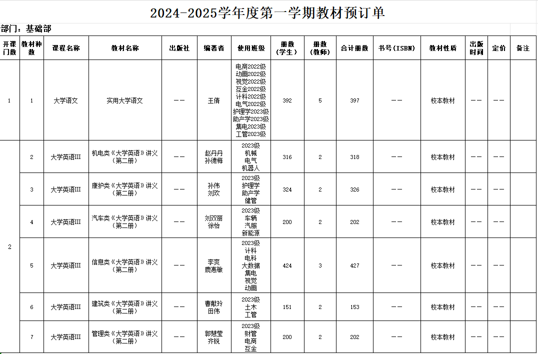 2024-2025学年第一学期基础部为老生共开设10门课程,选用教材16种,选用教材情况详见附表。