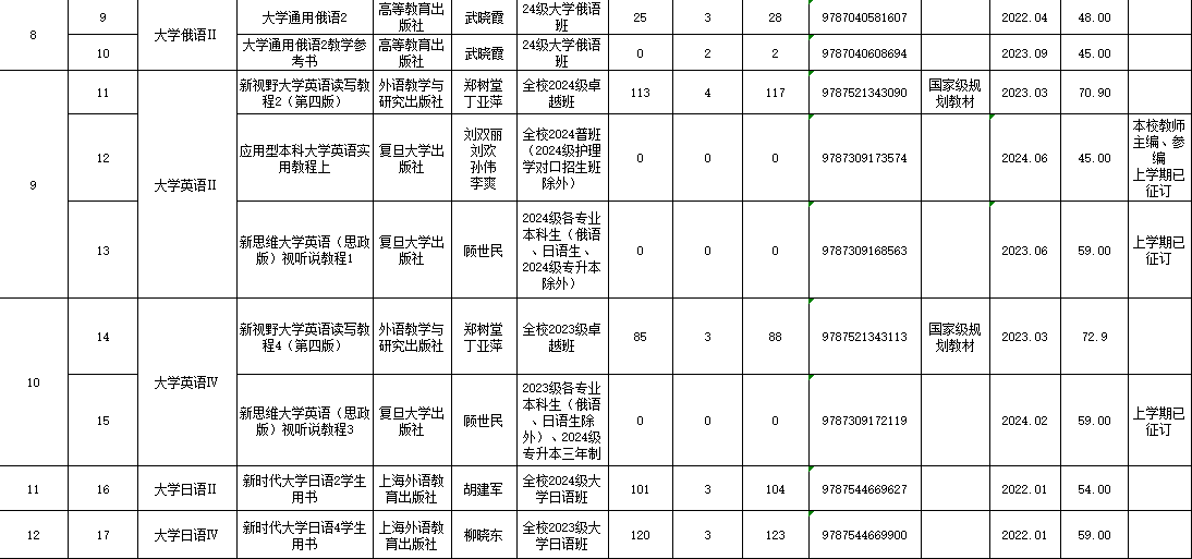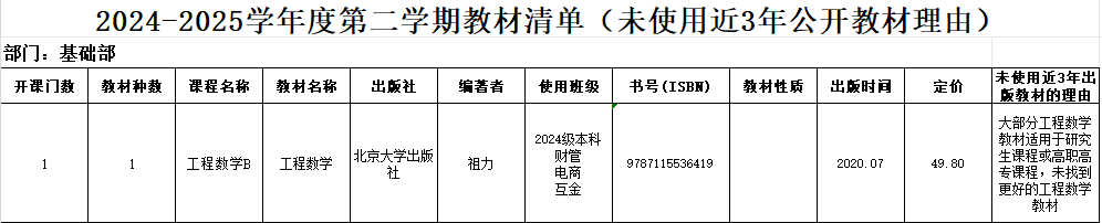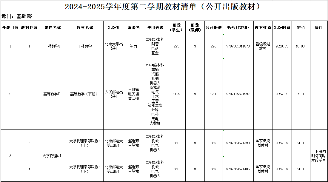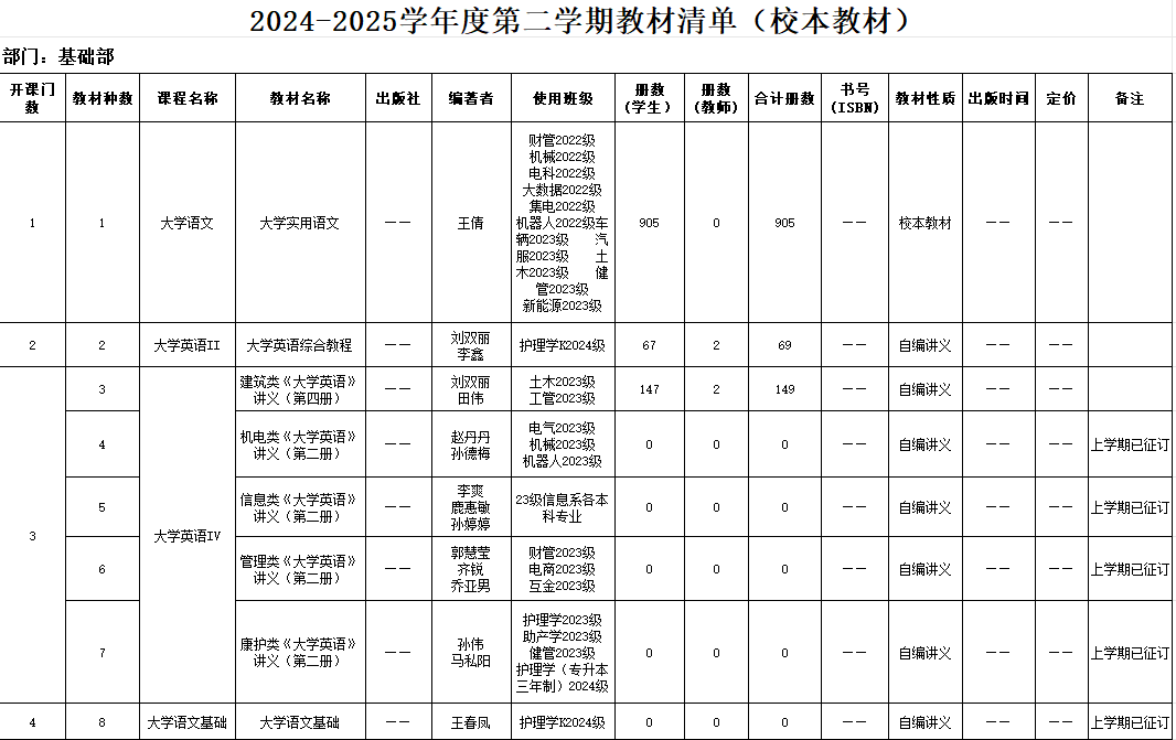 2024-2025学年第二学期基础部共开设16门课程,选用教材25种,选用教材情况详见附表。