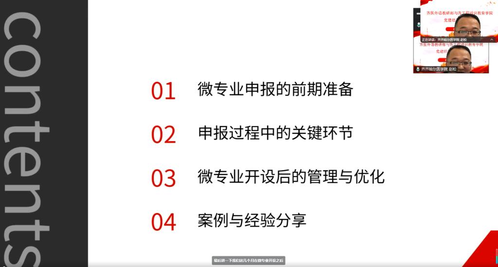 11月6日,齐齐哈尔工程学院通识教育学院党支部与齐齐哈尔医学院联合第三党支部共同举办了以“结对共建聚合力,党务业务深融合”为主题的党建结对共建活动。本次活动在线上进行,两支部以虚拟教研室为平台,围绕以微专业建设为主题的教学改革和外语“三进”工作展开交流,深入推进跨校党建联动与教学资源共享。此次活动由通识教育学院党支部书记张洪岩主持,齐齐哈尔医学院联合第三党支部书记程前光及所属支部党员全程参与,通识教育学院党支部全体党员及大学外语教研室全体教师参加,共40名教师,其中党员教师31人。
