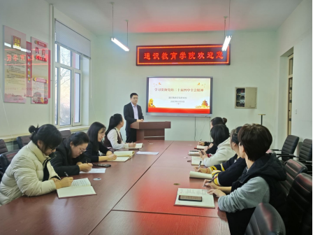 为深入学习贯彻党的二十届四中全会精神,12月9日下午,通识教育学院党支部张洪岩在三号教学区2308会议室作党的二十届四中全会精神宣讲,通识教育学院全体党员教师参加会议。