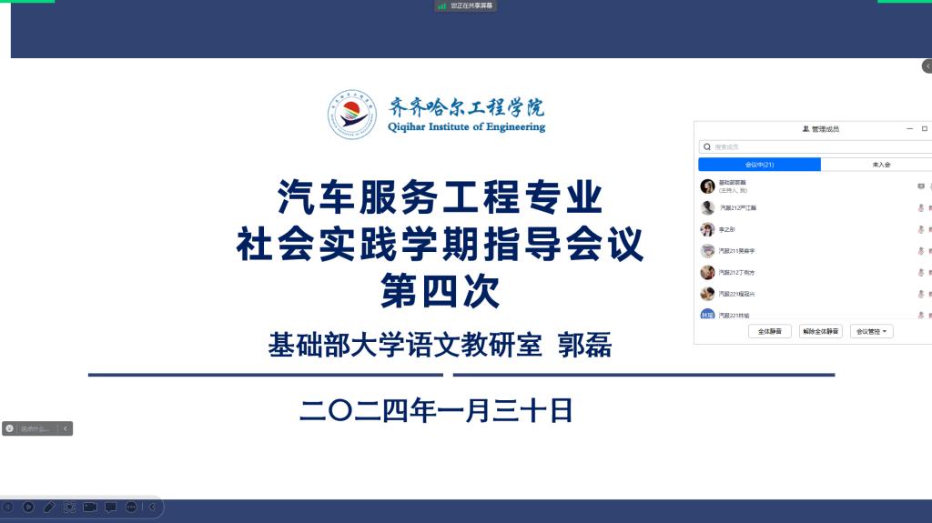 1月30日下午,生涯导师郭磊在线上召开机电工程系2024年社会实践学期qf2024005-qf2024010第四次指导会议,6个小组21名学生参加了此次会议。