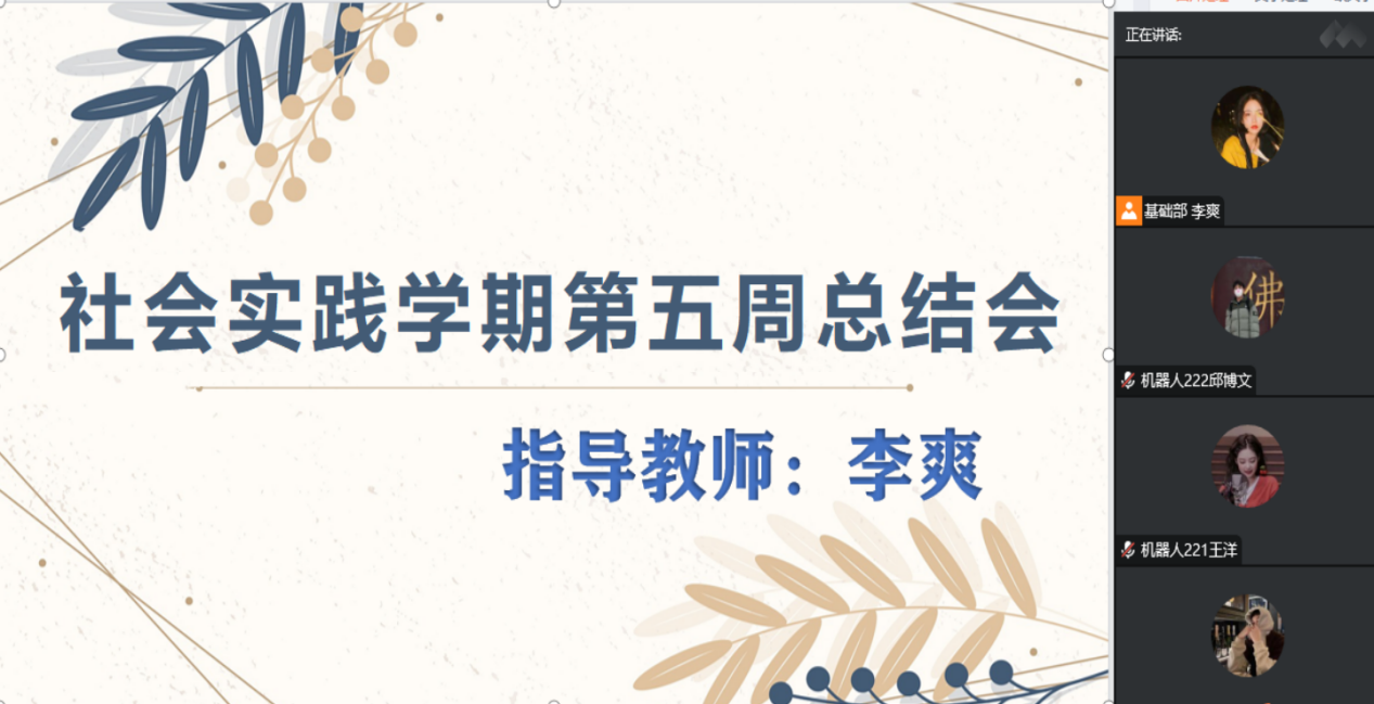 2月15日,机器人工程专业生涯导师李爽通过腾讯会议,组织召开了社会实践学期的第五周总结会,15名生涯学生全部按时参加了此次会议。