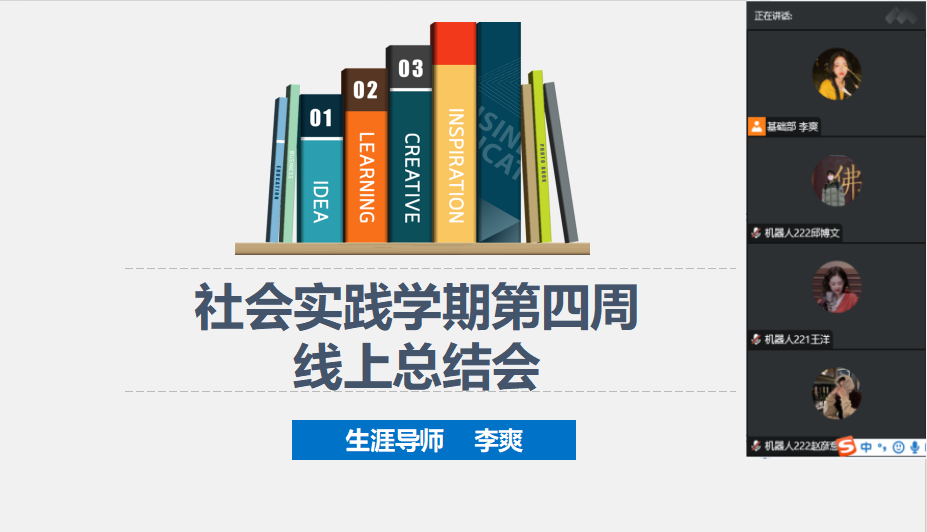 机器人工程专业生涯导师李爽于2025年2月9日召开社会实践学期第四次线上总结会,此次会议共十五人参加。