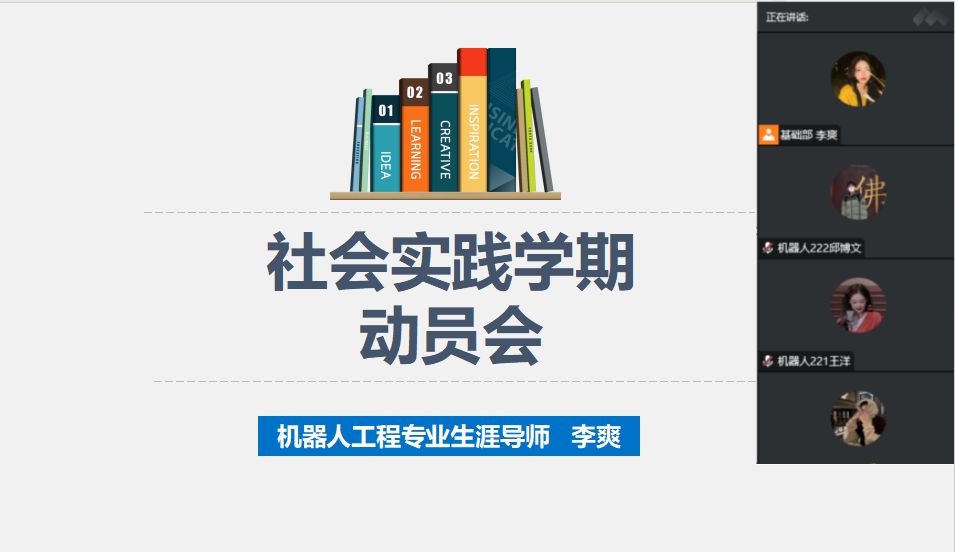 1月4日,机器人工程专业生涯导师李爽通过腾讯会议,组织召开了社会实践学期动员会,15名生涯学生全部按时参加了此次会议。