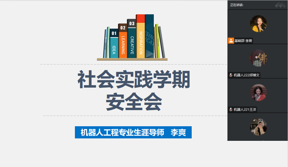1月12日,机器人工程专业生涯导师李爽通过腾讯会议,组织召开了社会实践学期安全会,旨在增强学生安全意识,确保社会实践学期活动顺利开展,15名生涯学生全部按时参加了此次会议。
