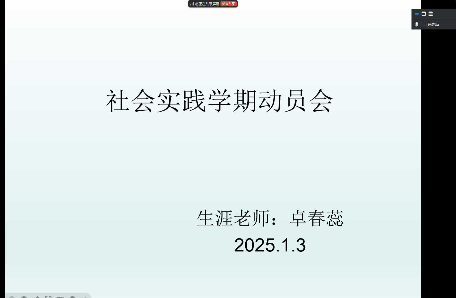2025年1月3日,生涯老师卓春蕊对所指导的机电工程系机械专业的7组同学开展社会实践学期动员会,主要讲解社会实践学期意义及指导思想,明确社会实践学期学习任务,针对学生提出问题进行解答,最后进行教师总结。动员会以学生的三五能力和核心素养的提升为目标,进行社会实践学期动员会,让学生在社会实践学期开始时保持热情、积极向上的态度来完成各项学习任务和社会活动,从而提高学生的社会实践能力。