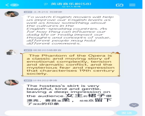 最后所有活动参加者通过QQ群分享了自己的心得,增强了同学们之间的交流。此次活既达到丰富大学生生活的目的,也为大学生进行英语交流、提升语言感知能力等提供了一个平台。
