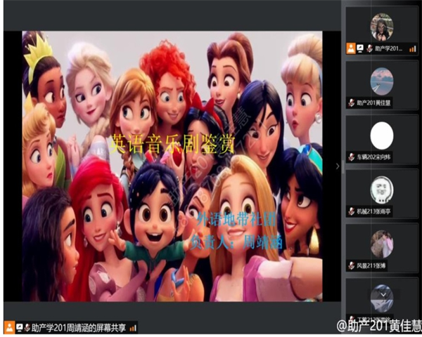 为了丰富大学生的校园生活,也为了提高英文交流的能力。外语地带社团于2022年3月28日通过腾讯会议举行英语音乐剧鉴赏,会议由社长周靖涵主持,外语地带全体部长及其他英语爱好者共58人参加活动并分享观后感。
