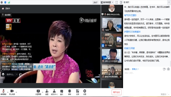 启动仪式结束后,学生在线观看了北京师范大学于丹教授《读书阅世养心明德》读书讲座。于丹教授认为,读书的终极目的是明辨是非,养心是给自己动力,明德是给自己准则。读书最终要学以致用,格物致知,走向“真自我”。讲座结束后,近300名学生进行了线上互动,交流心得感悟。同学们纷纷表示,要与书为友,沐浴书香,在书的海洋里畅游,不断成长。