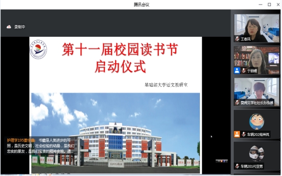 4月25日下午,学校第十一届校园读书节启动仪式线上举行。大学语文教研室全体教师,爱阅文学社社长孙泓博、求索文学社社长朱文旭、D.E.T推理社社长王浩然、18文艺连社长梁萧及各学生社团代表参加仪式。