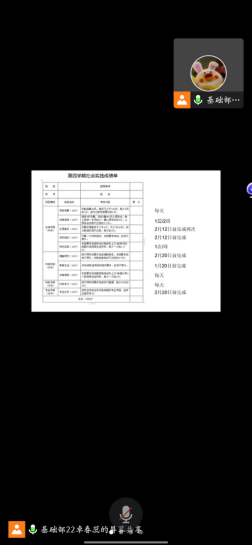 会议中,各小组汇报第四学期完成进度与进行中所遇到的困难,卓春蕊老师听后分别对小组进行指导,使同学们清楚明白地完成第四学期内容。后来,卓春蕊老师给同学们制定了阶段性任务的截止时间,以保证同学们高质量并且高效的完成第四学期内容。