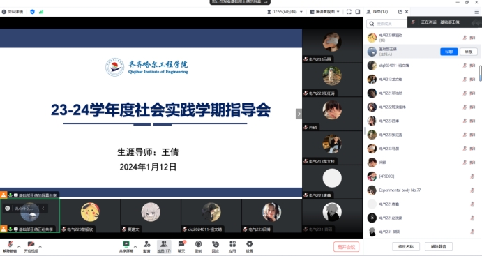 2024年1月12日,23-24学年度社会实践学期第一周的周末,生涯导师王倩针对社会实践学习和组长工作召开线上指导会,21级-23级全体生涯学生参加。