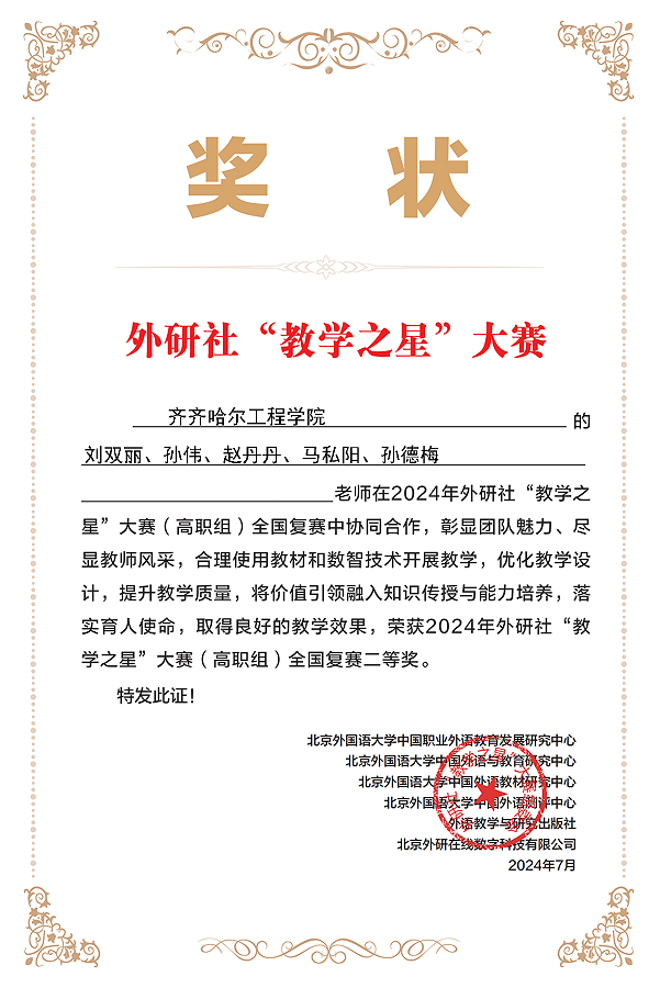 在2024年外研社“教学之星”比赛中,学校基础部大外教研室教师喜获佳绩。本科组中曹献玲、刘欢、李爽、徐怡、鹿惠敏老师荣获本科组全国复赛二等奖。高职组中刘双丽、孙伟、赵丹丹、马私阳、孙德梅老师荣获高职组全国复赛二等奖。