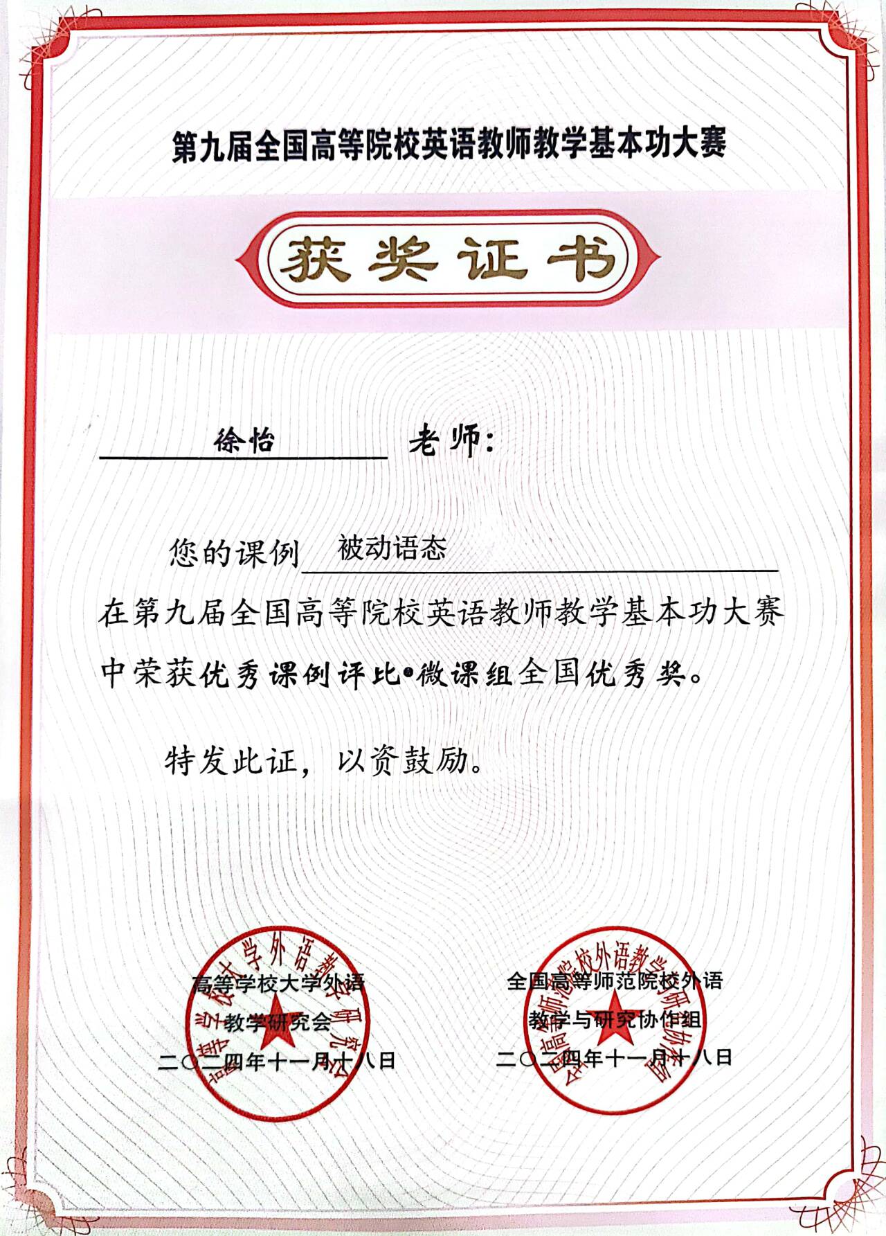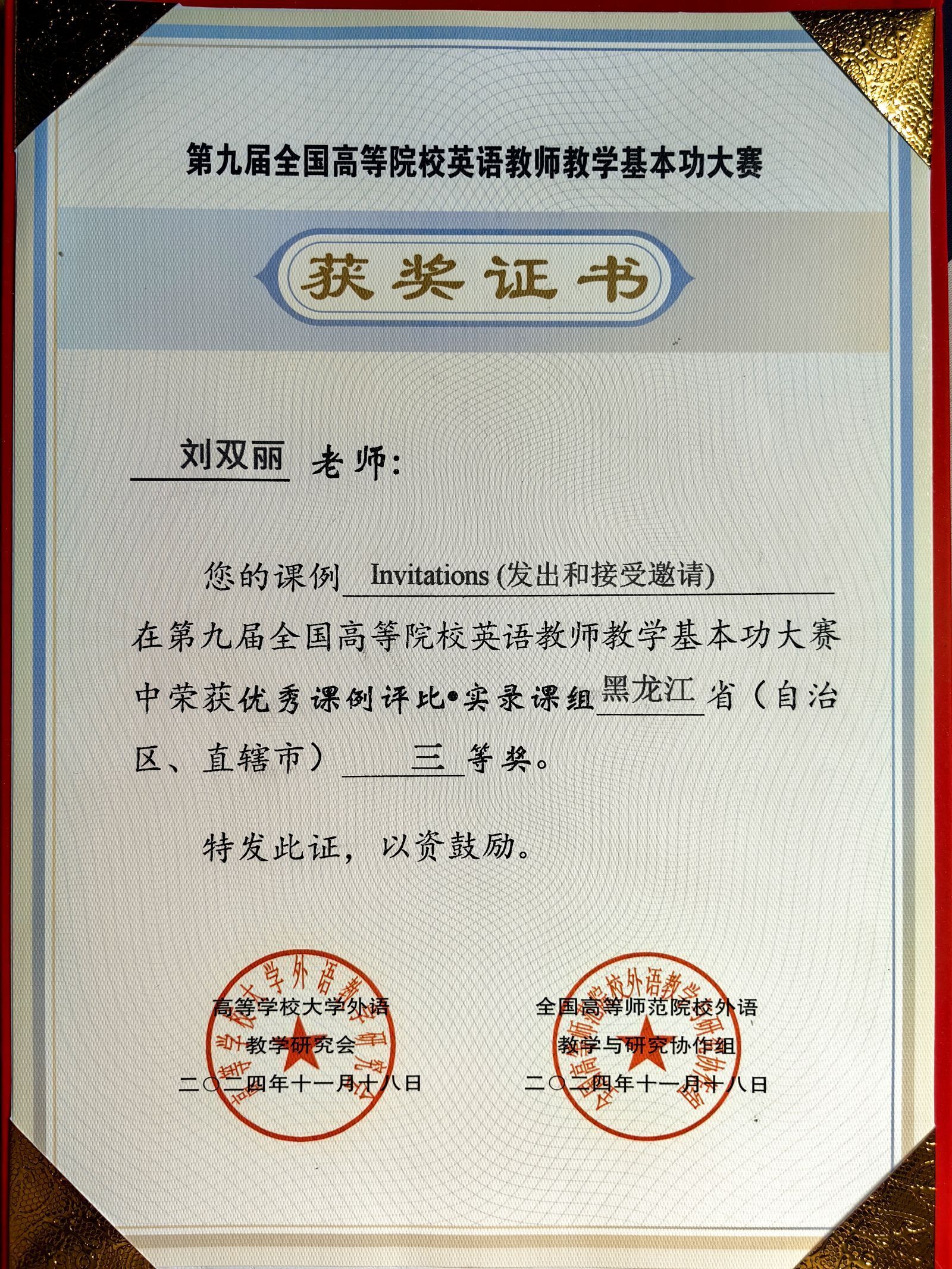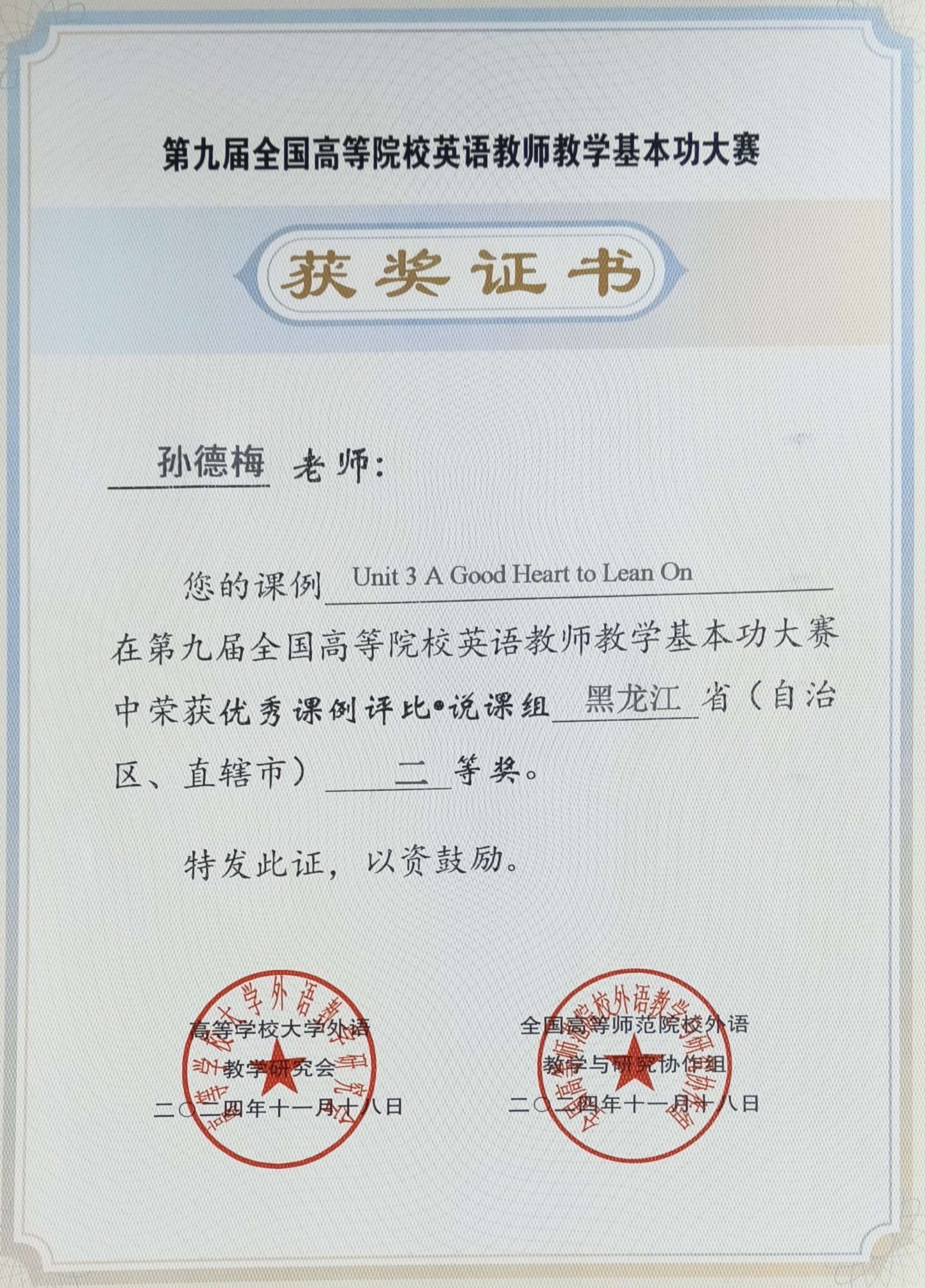 本次大赛是全国性专门针对高校英语教师的专项教学赛事,大学外语教研室教师积极参与并取得佳绩。其中,孙德梅荣获优秀课例评比•说课省级二等奖,刘欢、马私阳、孙伟、曹献玲、鹿惠敏荣获优秀课例评比•说课省级三等奖,刘双丽、李爽和孙婷婷均荣获优秀课例评比•实录课省级三等奖,徐怡、齐锐教师团队荣获优秀课例评比•微课省级优秀奖。