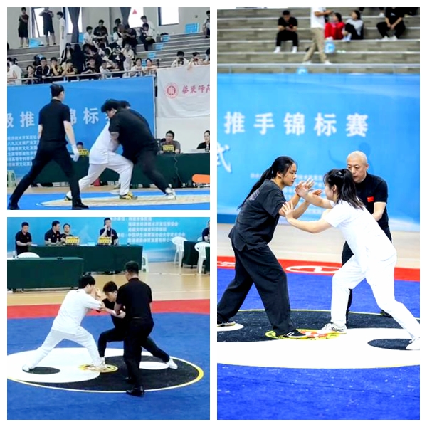 我校是首次参加中国大学生太极推手锦标赛,基础部教师韩淑梅选拔了我校武术队的卢昊、於金铭、谭俊杰3 名学生,分别参加女子 62 公斤级、男子 78 公斤级、男子 85 公斤级以上三项个人实战推手项目,并最终取得佳绩。
